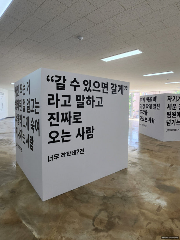 《너무 착한데?전 & 너무 별론데?전》은 표 하나로 두 전시를 모두 관람할 수 있어요. ‘너무 착한데?전’에서는 주변의 ‘착한 순간들’을 모아 따뜻한 인류애를 충전할 수 있고, ‘너무 별론데?전’에서는 공감 폭발하는 일상 속 웃픈 순간들을 만날 수 있어요. 전시장을 거니는 사람들조차 전시의 일부로 연출된다고 하니, 공감의 영감을 얻고 싶으신 마케터는 방문 추천! 😉