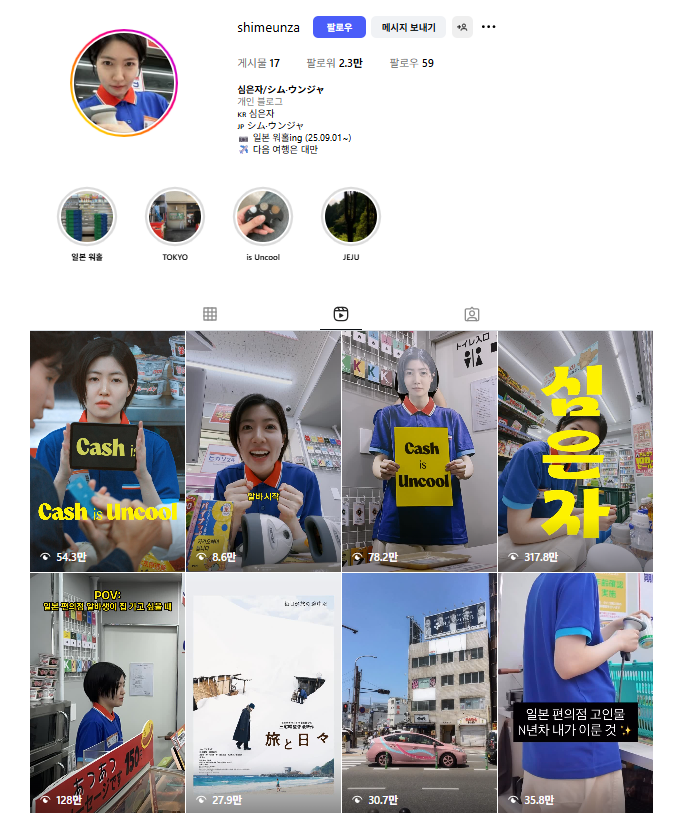 ‘심은자’(@shimeunza)라는 이름으로 개설된 SNS 계정은 마치 일본 워홀러가 편의점에서 아르바이트하며 일상을 기록하는 듯한 컨셉으로 운영되고 있어요. 일본을 배경으로 유행하는 챌린지에 참여하거나, 알바 중 생긴 에피소드를 올리는 등 업로드 되는 콘텐츠가 꽤 리얼해요. 계정이 처음 열렸을 땐 ‘진짜인가..? 대체 뭐지?’라는 반응이 많았을 정도로 자연스러죠. |