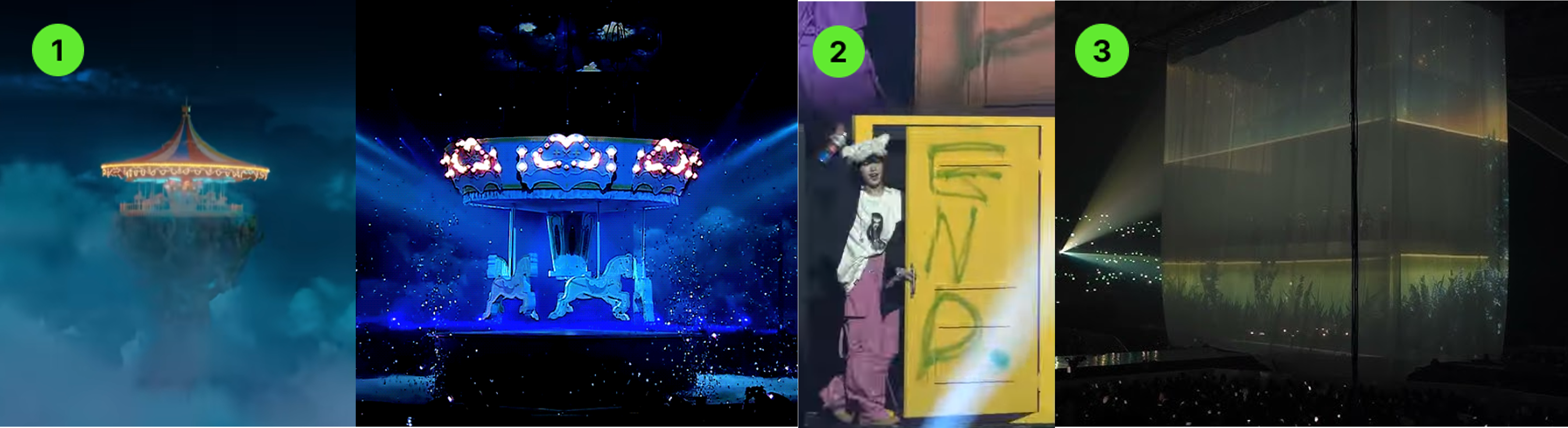‘네모로부터 시작하는 이세계! 여행’이라는 컨셉으로 진행된 콘서트에서는 애니메이션 <스즈메의 문단속>을 연상시키는 ‘문’ 오브제를 활용했어요. 공연 내내 문을 들락날락하며 무대를 전환하고, 마지막에는 락커로 ‘The End’를 적은 뒤 문 안으로 사라지는 연출로 마무리했어요. 콘서트의 컨셉을 엔딩까지 끌고 간 사례예요.