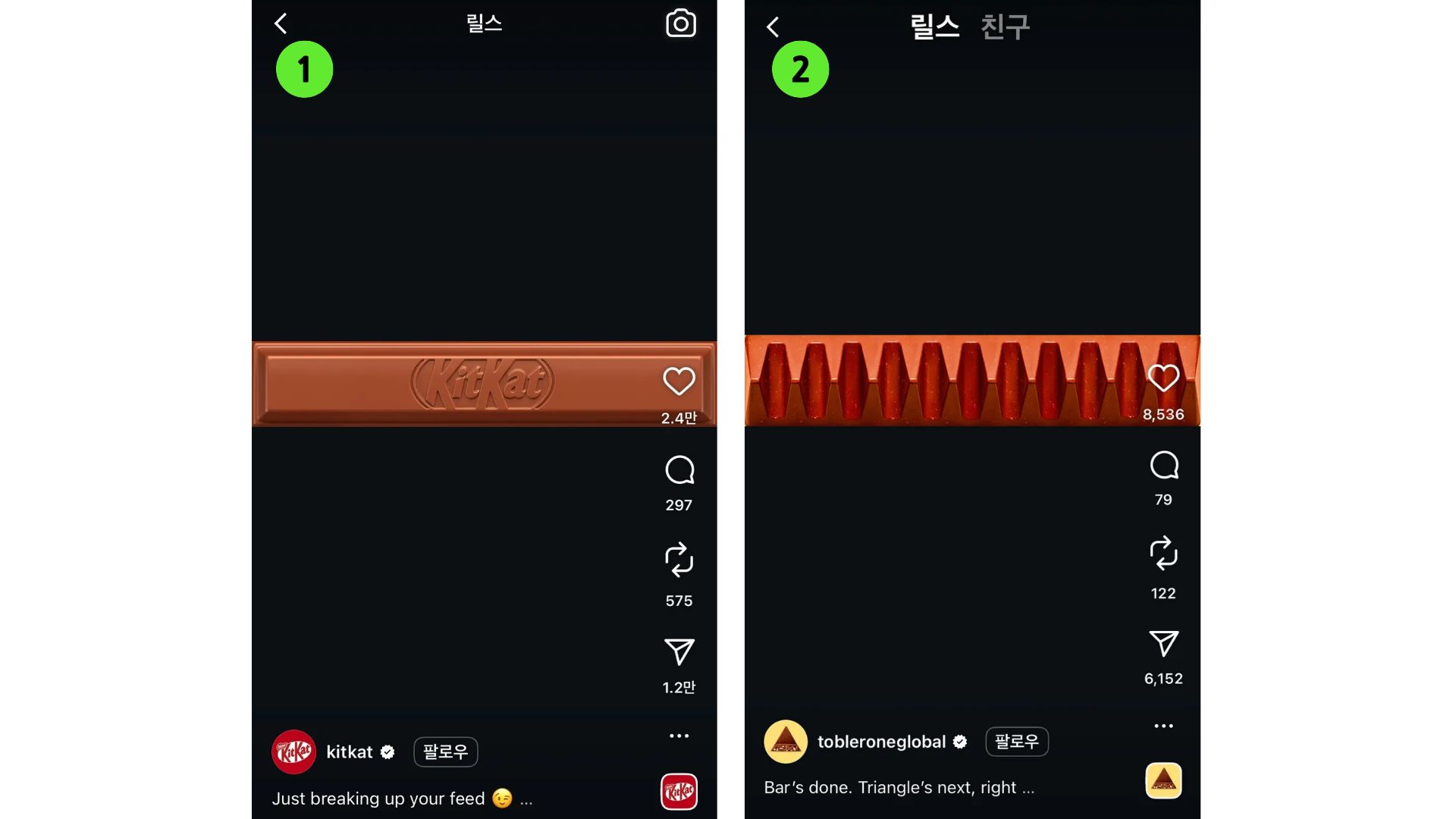 ①킷캣은 “Just breaking up your feed”라는 카피로, 마치 피드의 선을 쪼개는 듯한 연출을 보여줬고 ②토블론은 “Instagram just got tobleroned”라는 문구와 함께 업로드하며 유쾌하게 풀어냈어요. |