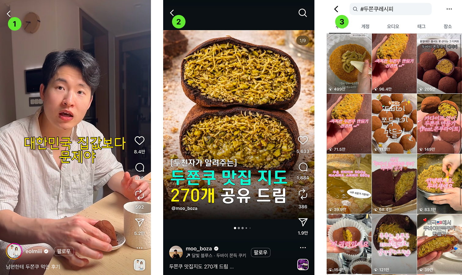 워낙 많은 디저트 가게에서 두쫀쿠를 판매하다 보니 ‘두쫀쿠 맛집 지도’를 공유하는 콘텐츠도 늘었고요. 비싸고, 레시피는 비교적 단순해 보여서 직접 만들어보는 영상도 빠르게 늘어나며 확산되었어요. (물론 성공은 전혀 쉽지 않다는 게 함정…🤭) |
