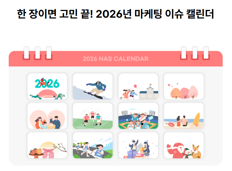나스미디어가 공개한 2026 마케팅 이슈 캘린더는 ‘언제 무엇을 할지’를 넘어 왜 그 시점이 중요한지를 이해하게 해주는 자료라는 점이 가장 큰 강점이에요. 연휴·기념일뿐 아니라 대형 스포츠 이벤트, 글로벌 페스티벌, OTT·영화 공개 시점 등 소비자 관심과 트래픽이 집중되는 순간들을 중심으로 정리돼 있어 연간 마케팅 흐름을 한눈에 그려볼 수 있습니다.