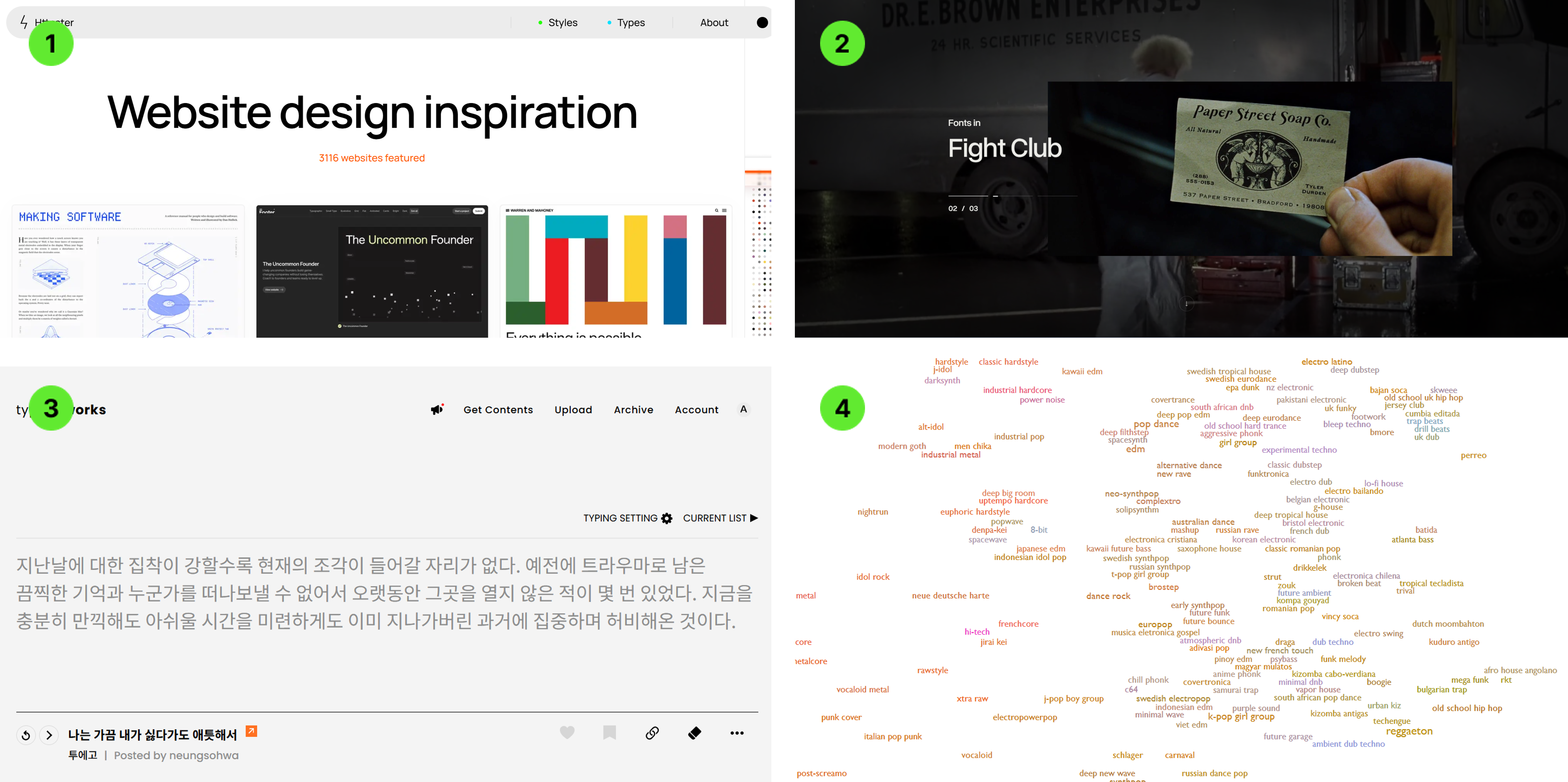 아이디어가 도저히 떠오르지 않는 날, 아래 사이트들에 그냥 들어가 보기만 해도 도움 될 때가 있어요. 이미지 말고도 웹 구조, 텍스트, 사운드에서 힌트가 생기기도 하더라고요!