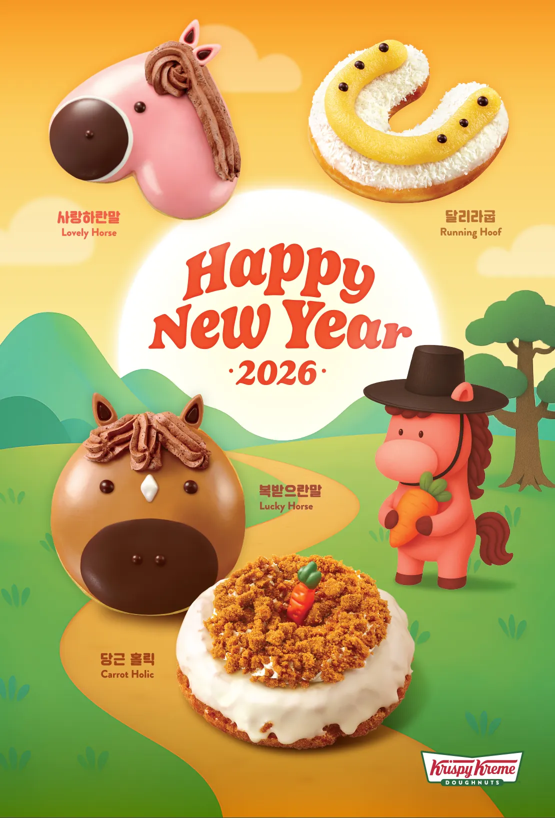‘붉은 말’ 컨셉을 패키지나 신제품에 직접적으로 녹이기 어렵다면, 크리스피크림 도넛처럼 카피로 풀어보는 방법도 있어요! 크리스피크림 도넛은 [사랑하란말 / 달리라굽 / 복받으란말 / 당근 홀릭] 총 4개의 신제품을 출시하며 이름을 센스있게 지었는데요. 자칫 올드하게 느껴질 수 있는 ‘붉은 말’이라는 소재를 귀엽고 위트 있는 언어로 재해석해 브랜드 특유의 밝은 무드로 잘 풀어낸 사례처럼 보여요.