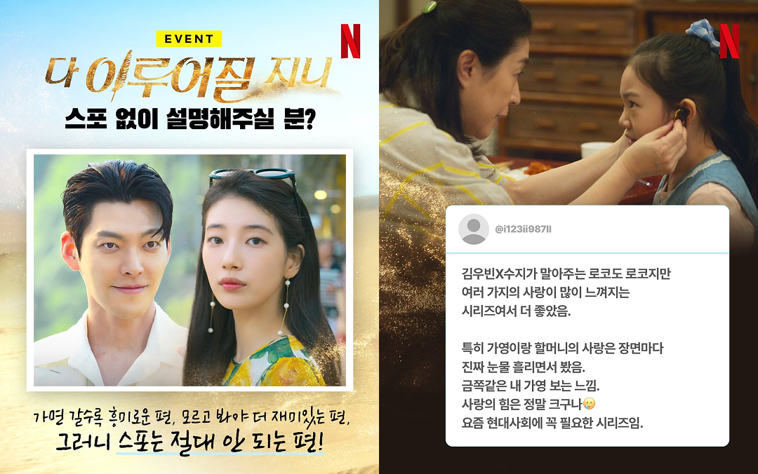회차가 쌓일수록 숨겨진 반전이 하나씩 드러나는 드라마 <다 이루어질 지니>. 작품 특성 상 스포 없이 설명하라는 질문엔 선뜻 말이 막히기도 하는데요. 넷플릭스는 바로 이 ‘설명하기 어렵다’는 특성 자체를 마케팅 포인트로 삼았어요. 줄거리 대신, 시청자가 느낀 재미를 말하게 하는 ‘노스포 예스잼 설명법’ 이벤트를 연 거죠.