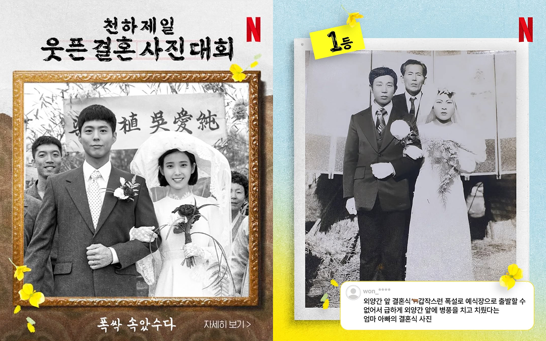 우리를 웃고 울렸던 <폭싹 속았수다>, 기억나시나요? 극 중 주인공 애순이 다소 웃긴 모자를 쓰고 결혼하는 장면이 인상 깊었는데요. 넷플릭스는 이 장면에서 착안해 ‘웃픈 결혼 사진대회’ 이벤트를 열었어요.