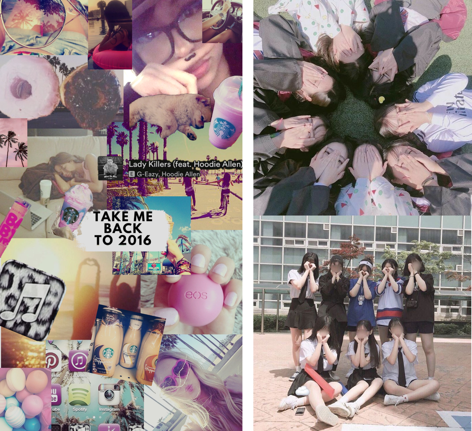 해외에서는 주로 야자수, 컬러풀한 아이스크림, 스냅챗 강아지·꽃 왕관 필터 같은 이미지들이 다시 돌고 있고요. 이 트렌드가 한국에 들어오면서는 B612, 싸이메라의 노란 필터, 묘하게 저화질인 체육대회 단체사진, 트와이스 <Cheer Up>, 프로듀스101 <Pick Me>같은 이미지들이 대표적으로 소환되고 있어요. 지금 보면 살짝 촌스럽지만, 그 촌스러움을 순수하게 즐겼던 시절이었죠. 🥹 |