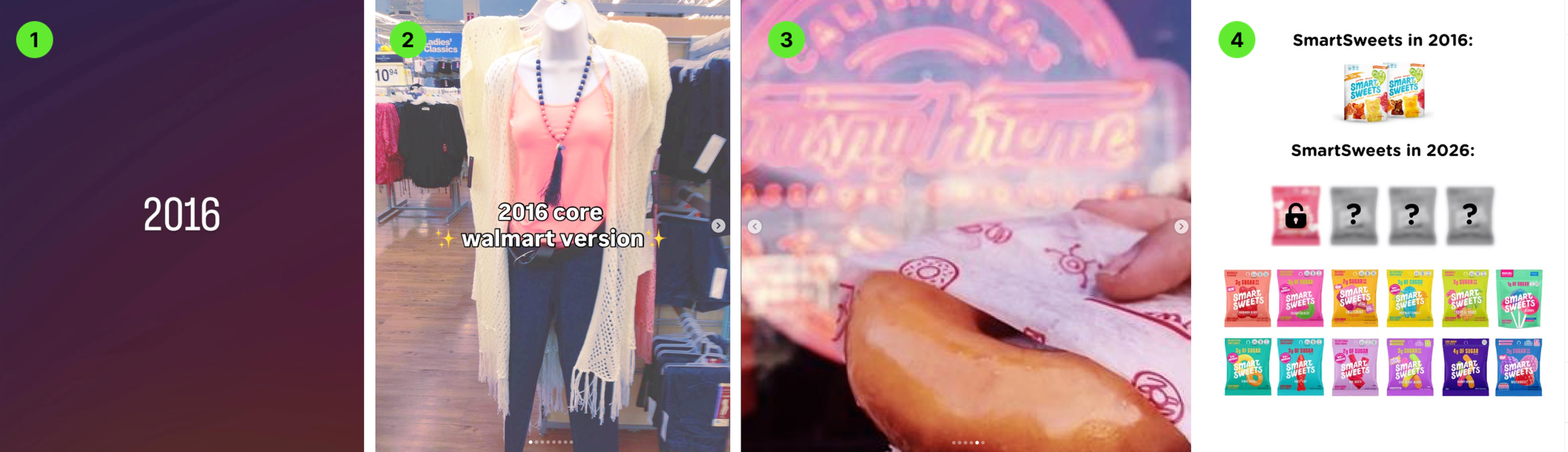 모두가 2016년 감성에 반응하는 요즘, 해외 기업 계정들까지 직접 ‘2016 코어’를 끌어다 쓰고 있어요. ①인스타그램은 공식 계정에서 “even used the rio filter <3”라며 대놓고 2016년 필터를 언급했고, ②월마트는 노란 필터와 약간은 촌스러운 옷과 함께 월마트 버전 2016코어를 선보였어요. ③ 크리스피 크림 역시 노란 필터 잔뜩 씌운 도넛 사진을 올렸구요. ④캔디 브랜드 SmartSweets은 2016년 단촐했던 패키지와 2026년 화려해진 라인업을 비교했어요! 이번 달 콘텐츠를 아직 고민 중인 마케터라면, 노란 필터를 적극 활용해보는 것도 좋을 거 같아요.👀 (역사가 있는 브랜드라면, 2016년 vs 2026년을 비교해보는 것도 좋겠죠!) |