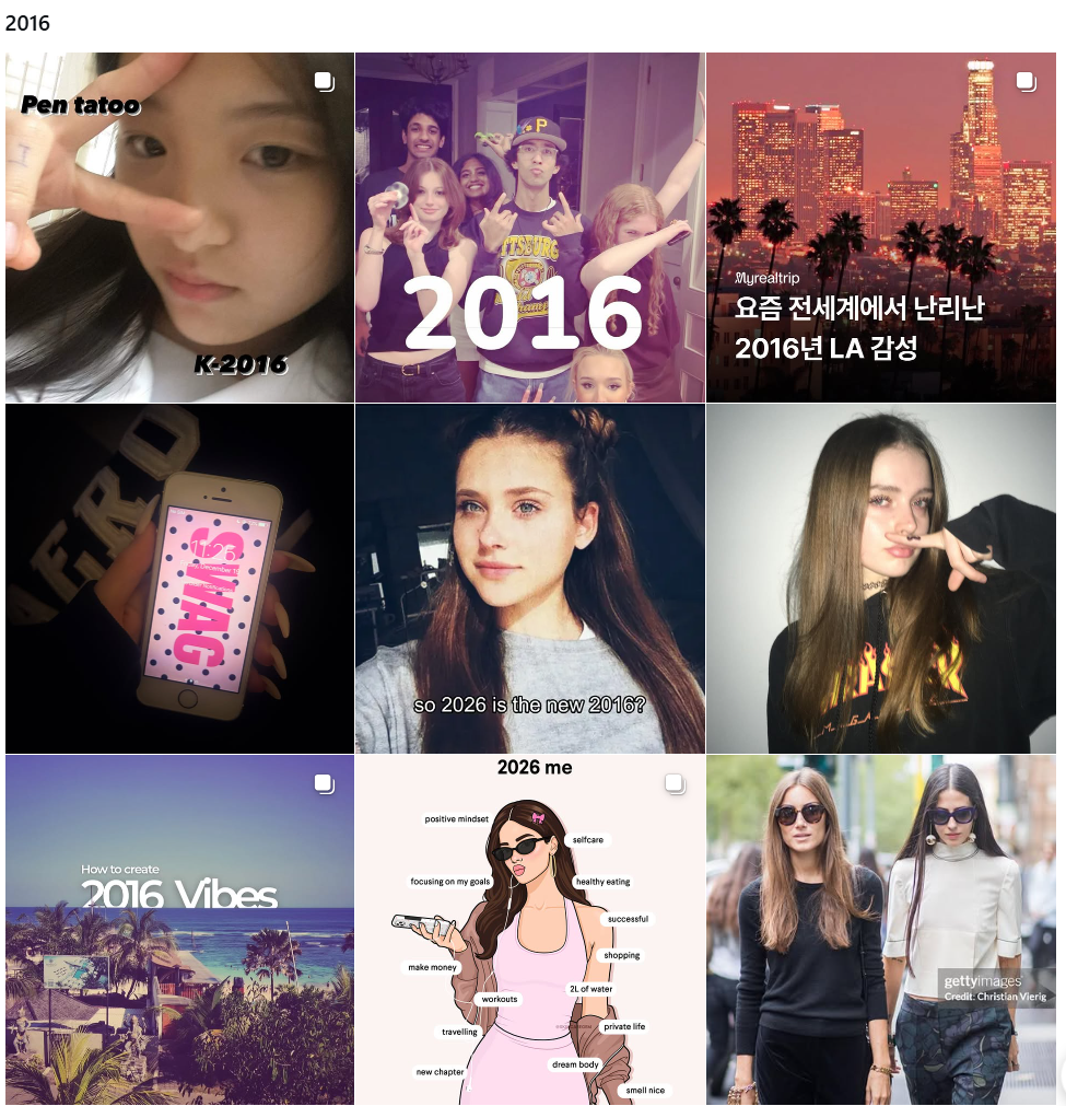 사실 사람들이 그리워하는 건 ‘2016년’ 자체라기보다 그 때의 나였어요. 지금으로부터 10년 전인 2016년은 현재 20대 중후반에서 30대 초반인 사람들이 가장 철없을 수 있었던 학창 시절이었고, 인스타그램이 본격적으로 유행하면서 사진으로 나를 드러내는 게 자연스러워지던 때이기도 했죠. 요즘 SNS는 사진도, 편집도 잘해야 하고 의미도 있어야 하지만, 2016년은 화질이 낮아도 되고 필터가 과해도 되고 그냥 올려도 감성이 되는 시절처럼 느껴지는 거죠.🥲