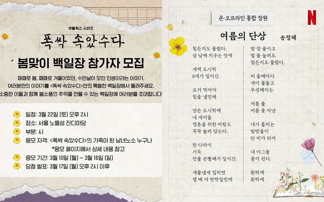 또한 〈폭싹 속았수다〉는 온라인 이벤트에 그치지 않고, 오프라인까지 경험을 확장했어요. 문학을 사랑했던 극 중 애순이처럼, 시청자들도 직접 이야기를 써볼 수 있는 ‘봄맞이 백일장’ 이벤트를 기획한 건데요.