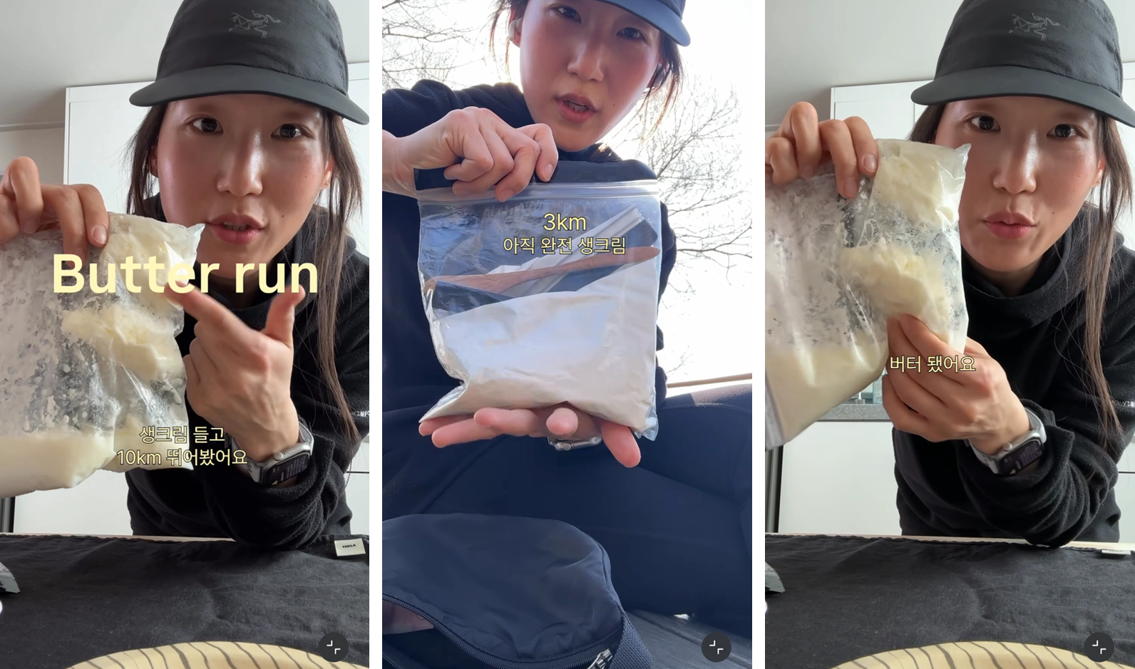 보통 러너들은 5~10km 정도 달린 뒤 결과를 확인하는데요. 실제로 버터와 버터밀크가 분리되기도 하고, 어떤 경우에는 그냥 휘핑크림 상태로 끝나기도 해요.😂 ‘지방을 태우면서 동시에 지방(버터)을 만든다.’는 농담까지 등장한, 요즘 SNS에서 화제가 된 러닝 트렌드입니다! |