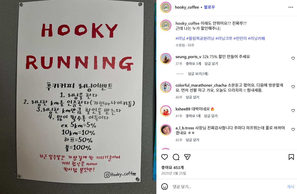 요즘 카페에서는 이런 트렌드를 활용해 러닝 후 카페에 방문해 기록을 인증하면 km만큼 할인을 해주거나, 커피나 디저트를 무료로 증정하는 이벤트를 하기도 해요!