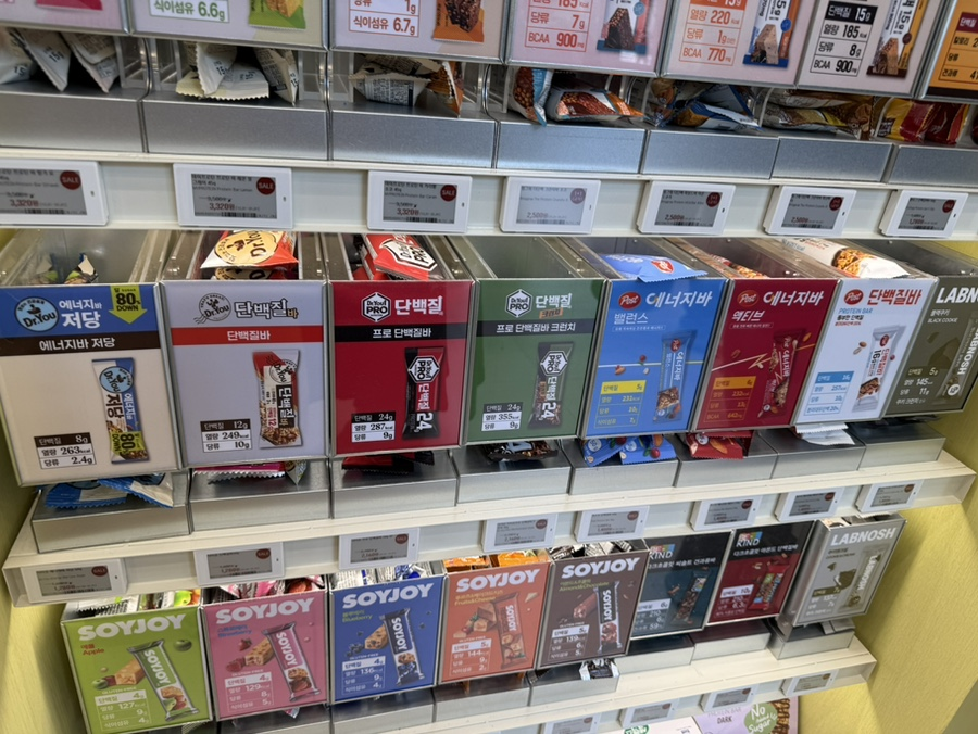 프로틴바 코너의 경우, 각 브랜드의 단백질 함유량과 칼로리를 한눈에 비교할 수 있도록 배치해두었어요. 제품을 하나씩 뒤집어보지 않아도 소비자가 쉽게 비교할 수 있도록 만든 점이 인상적이죠.
