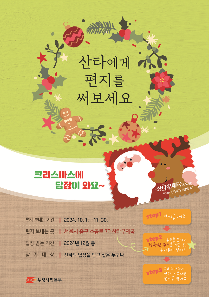 올겨울, 산타에게 편지를 쓰면 크리스마스에 답장을 보내준대요!🎄우정사업본부가 '산타에게 편지쓰기'라는 아주 귀여운 이벤트를 시작했어요. 정성들여 편지를 쓰고, 우표를 붙여 우체통에 쏙 넣으면 참여 완료! 산타 할아버지에게 답장 받고 싶은 쿠키즈라면 꼬옥 참여해보세요.🤭